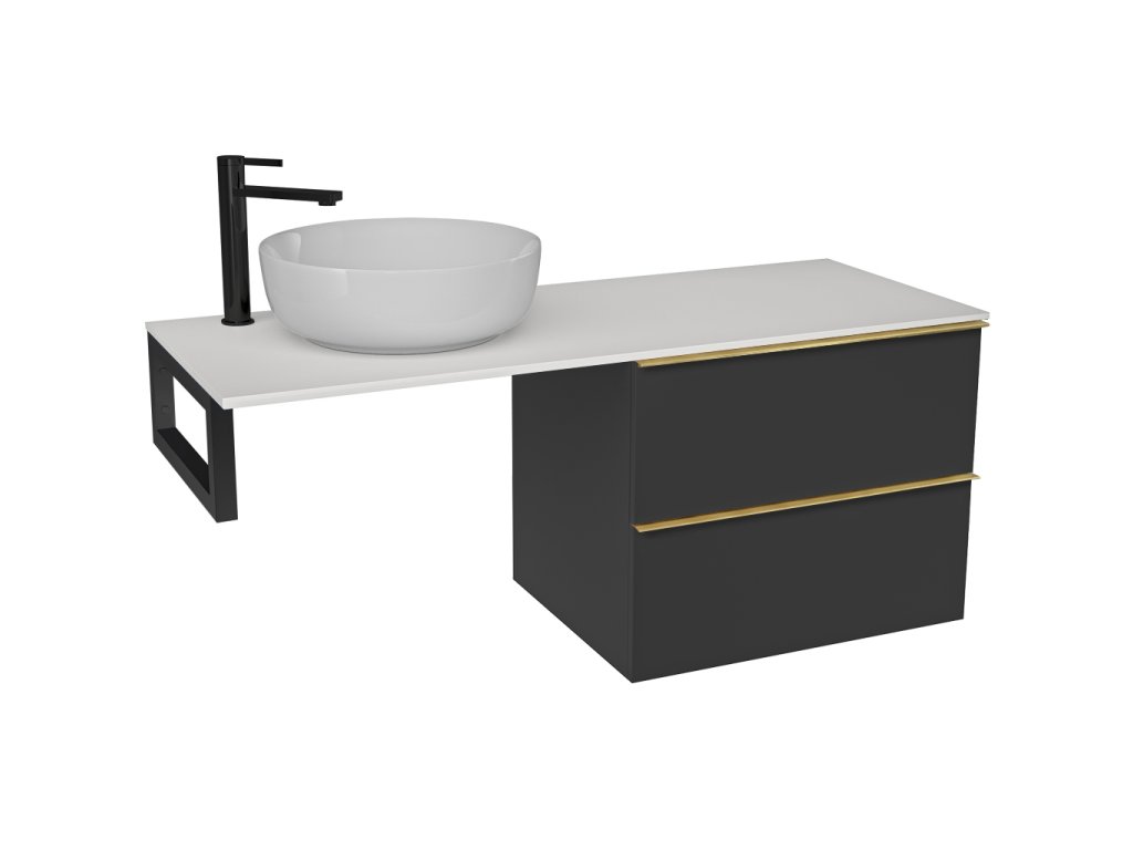 CERANO - Doska pod umývadlo z liateho mramoru Elanys - 140x46,5x1,2 cm - skrinka Velora 69 cm - čierna matná, zlatá úchytka - konzola čierna