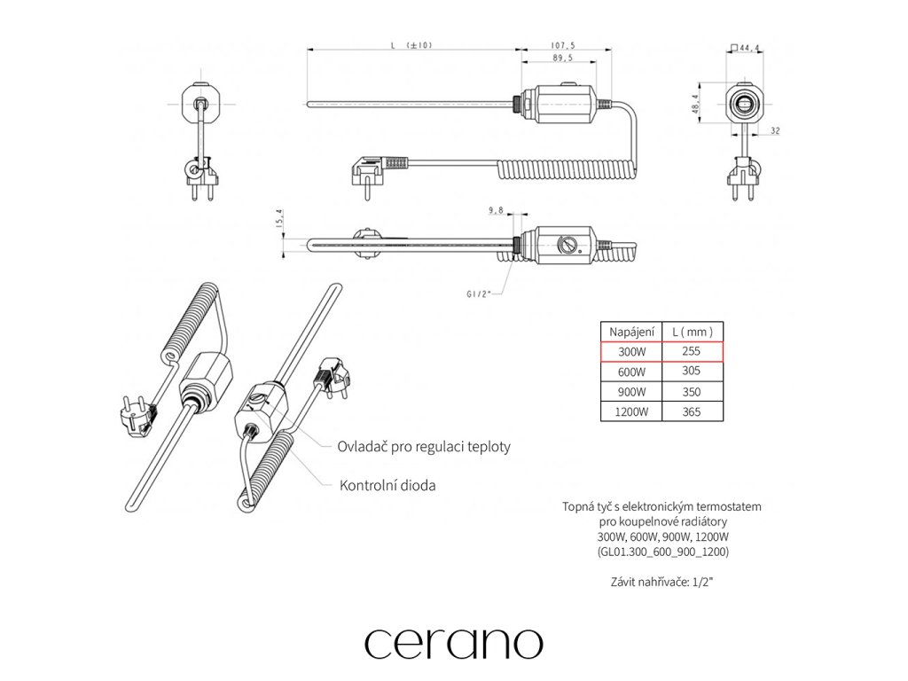CERANO - Elektrická vykurovacia tyč s termostatom 300W - čierna matná