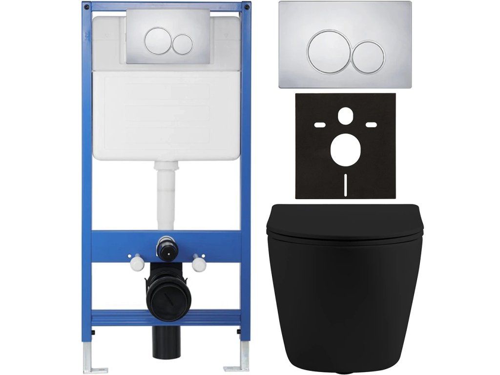 CERANO - Kompletný podomietkový WC set Lite/Cesso - čierna matná - WC tlačidlo Duo, chróm - predstenová inštalácia - 49x36 cm