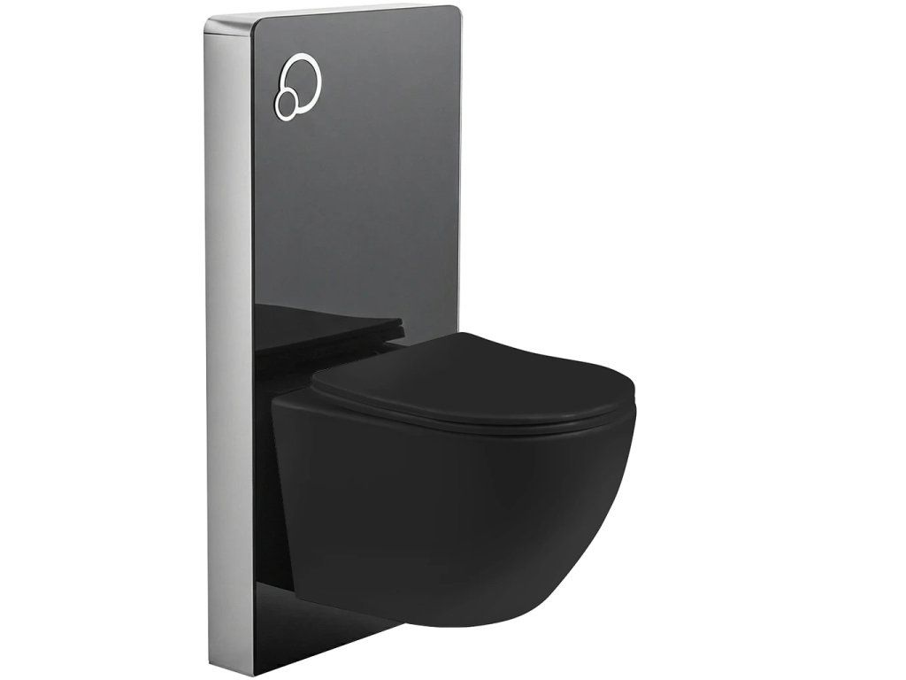 CERANO - Kompletný WC set sanitárny splach. modul - čierna matná + WC závesné Verde, Rimless + Slim/UF sedátko - čierna lesklá - 49x36 cm