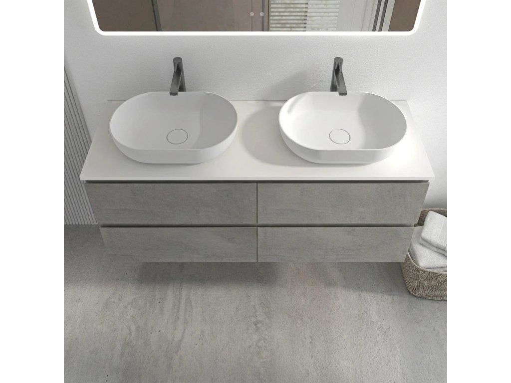 CERANO - Kúpeľňová skrinka Carole - betónovo šedá + doska pod umývadlo z lit. mramoru Elanys - 12 mm - biela matná - 140x49,2x46 cm