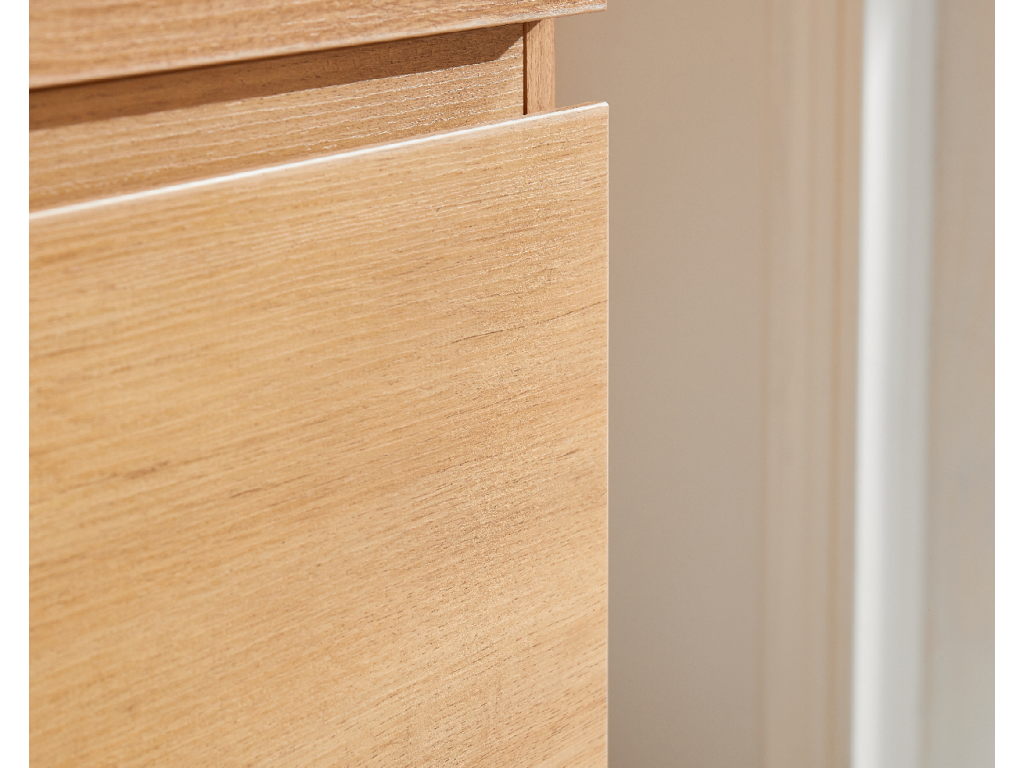 Vďaka integrovanému soft-close mechanizmu sa dvierka a zásuvky zatvárajú plynulo a ticho – hydraulický doraz tlmí náraz, zabraňuje búchaniu a znižuje opotrebenie, takže nábytok vydrží dlhšie a používanie je pohodlné.