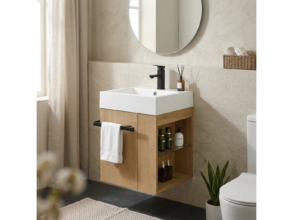 CERANO - Kúpeľňová skrinka Esme - dub medový + umývadlo z lit. Mramoru - biela matná - 45x45x63 cm