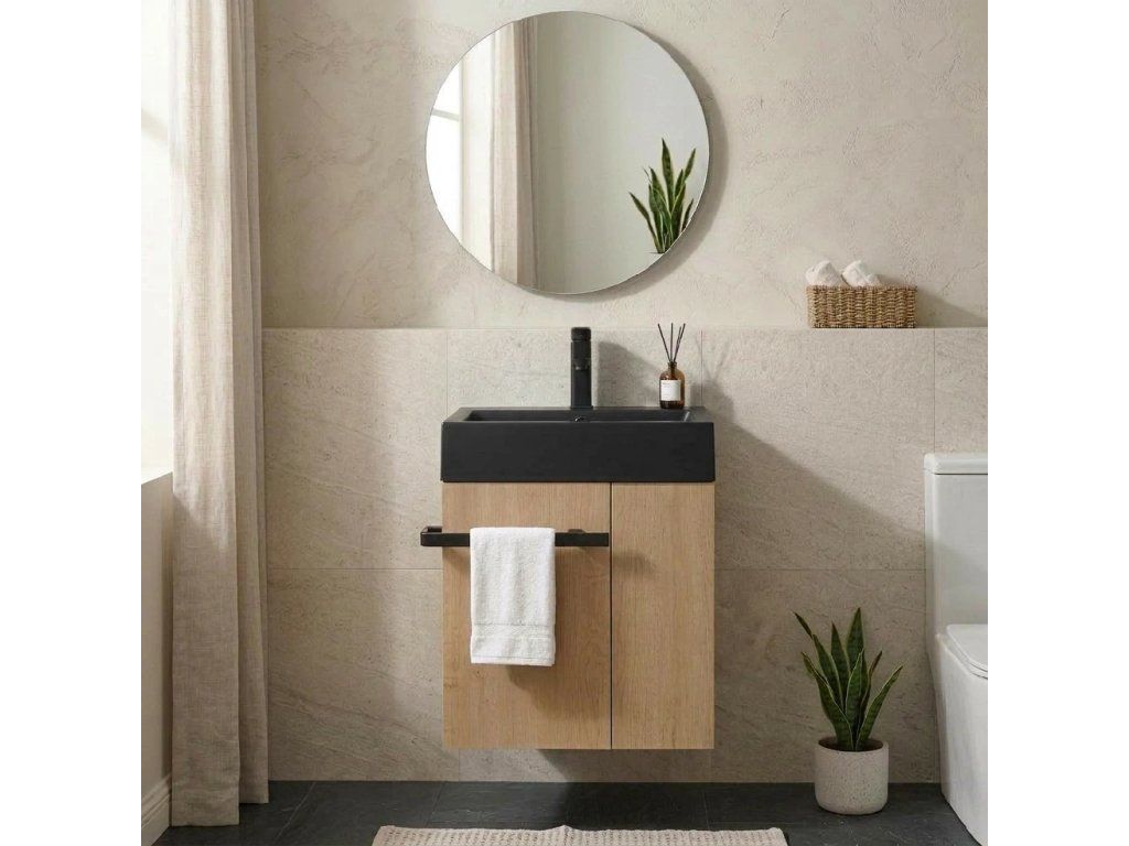 CERANO - Kúpeľňová skrinka Esme - dub medový + umývadlo z lit. Mramoru - čierna matná - 45x45x63 cm