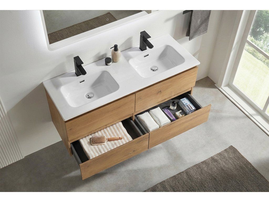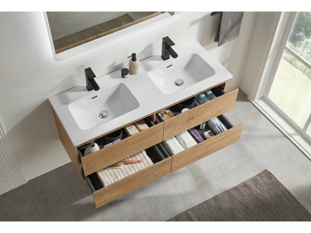 CERANO - Kúpeľňová skrinka pod umývadlo Carole + keramické dvojumývadlo Novo - dub medový - 121x49,5x46,5 cm