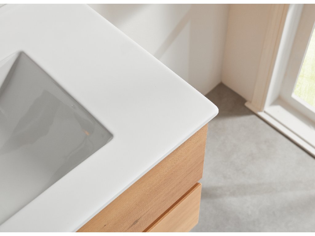 Kúpeľňové skrinky sú vyrobené z MDF lamina (stredne hustá drevovláknitá doska) s nalisovanou melamínovou fóliou, ktorá je odolná voči vlhkosti, poškriabaniu, UV žiareniu a bežným čistiacim prostriedkom. Povrch je hladký, tvrdý, homogénny a ľahko sa čistí. MDF dosky sa nekrútia ako masívne drevo. Pokiaľ dôjde k mechanickému narušeniu laminácie, samotné MDF jadro môže navlhnúť.