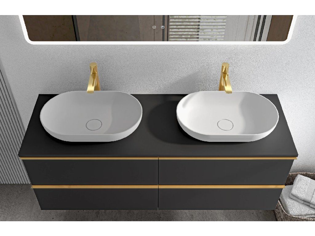 CERANO - Kúpeľňová skrinka Velora - čierna matná, úchytka zlatá + doska pod umývadlo Navira Slim - 18 mm - 140x54, 8x46, 5 cm