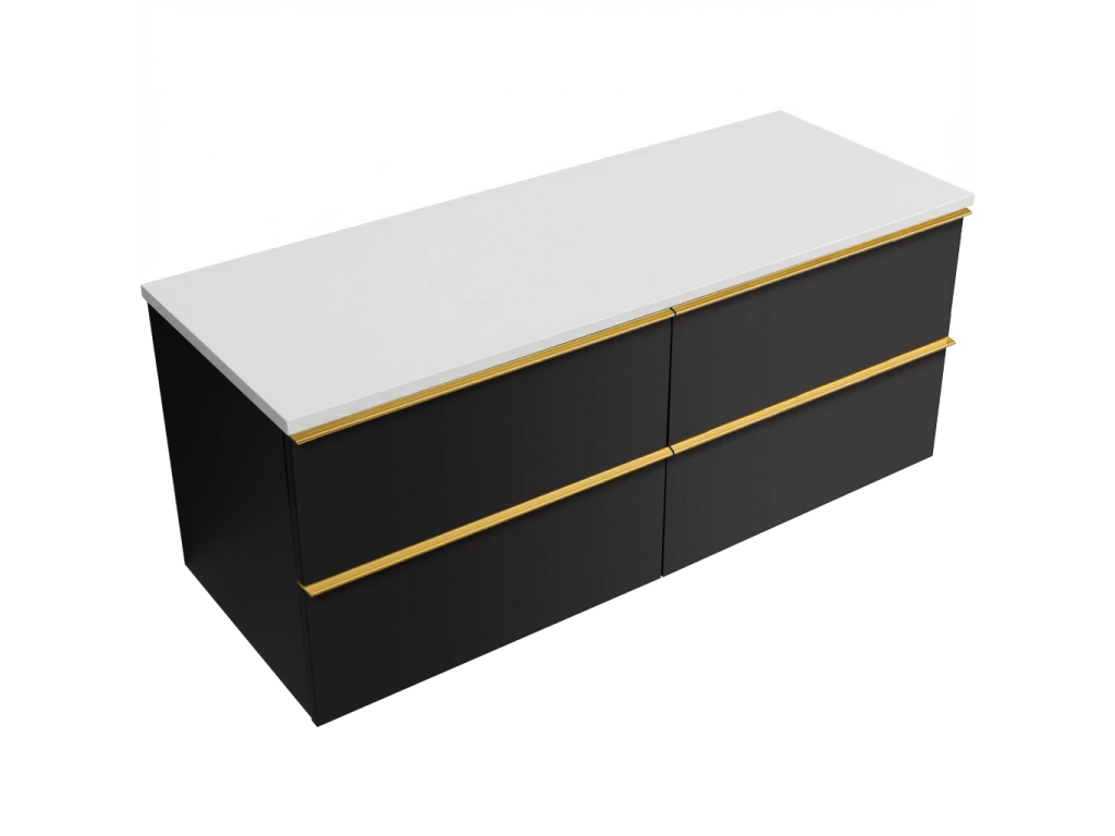 CERANO - Kúpeľňová skrinka Velora - čierna matná, úchytka zlatá + doska z lit. mramoru Elanys - 12 mm - biela matná - 140x54,2x46,5 cm