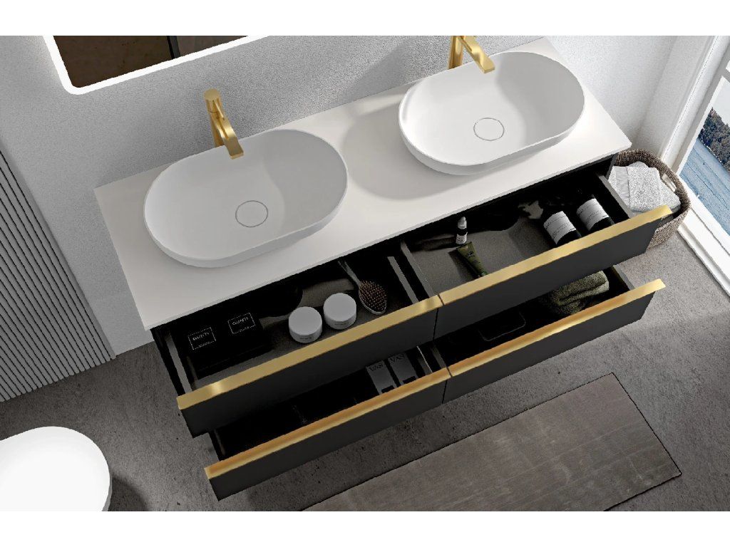 CERANO - Kúpeľňová skrinka Velora - čierna matná, úchytka zlatá + doska z lit. mramoru Elanys - 12 mm - biela matná - 160x54,2x46,5 cm