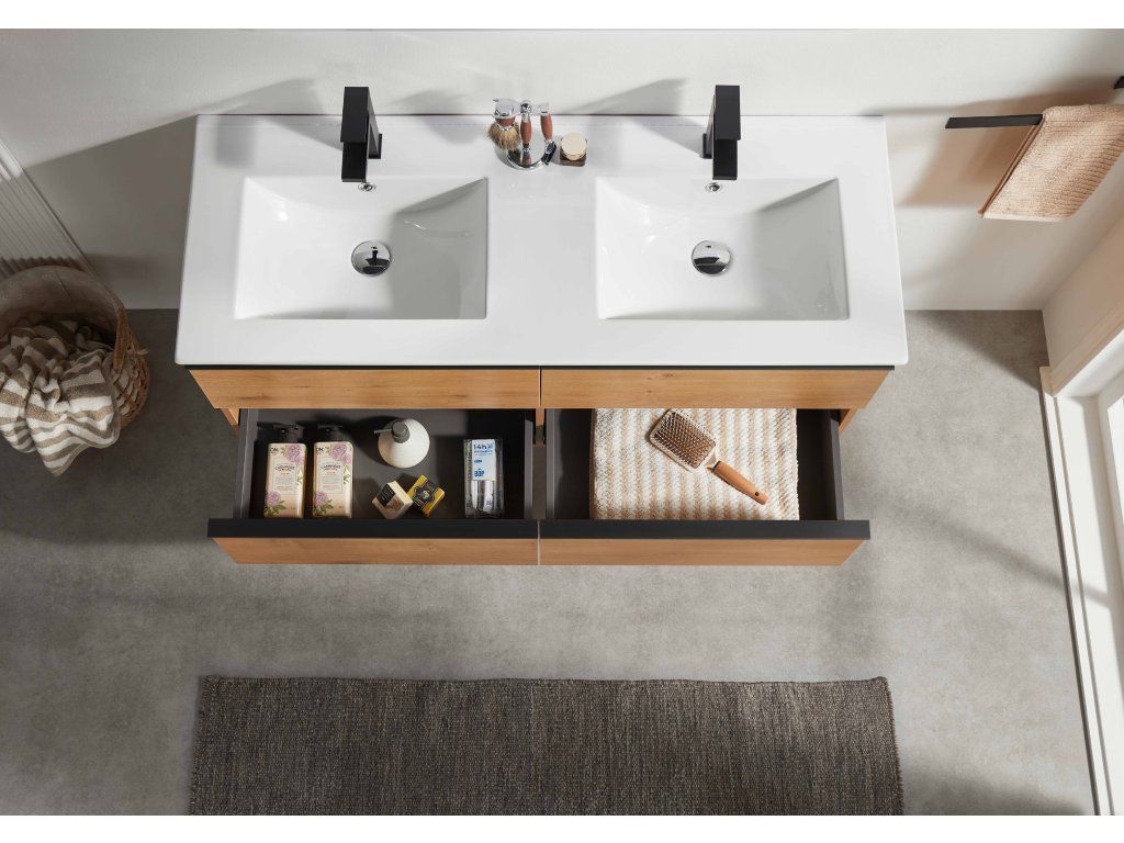 CERANO - Kúpeľňová skrinka Velora - dub medový, úchytka čierna + keramické umývadlo Todo - 121x55x46, 5 cm