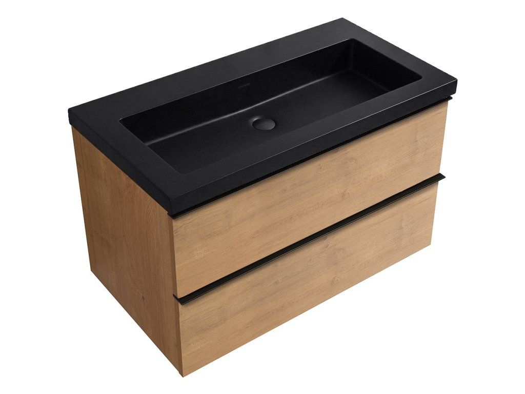 CERANO - Kúpeľňová skrinka Velora - dub medový, úchytka čierna + umývadlo z lit. mramoru Ovo - čierna matná - 80,5x58x46,5 cm