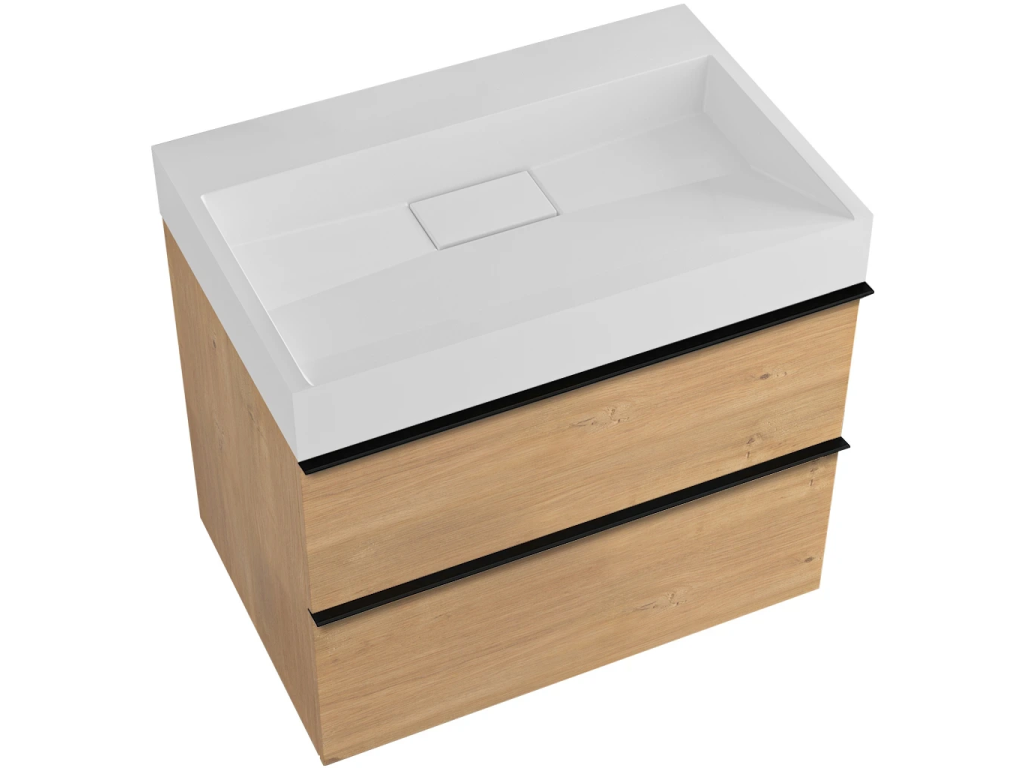 CERANO - Kúpeľňová skrinka Velora - dub medový, úchytka čierna + umývadlo z lit. mramoru Vita - biela matná - 70x63x46, 5 cm