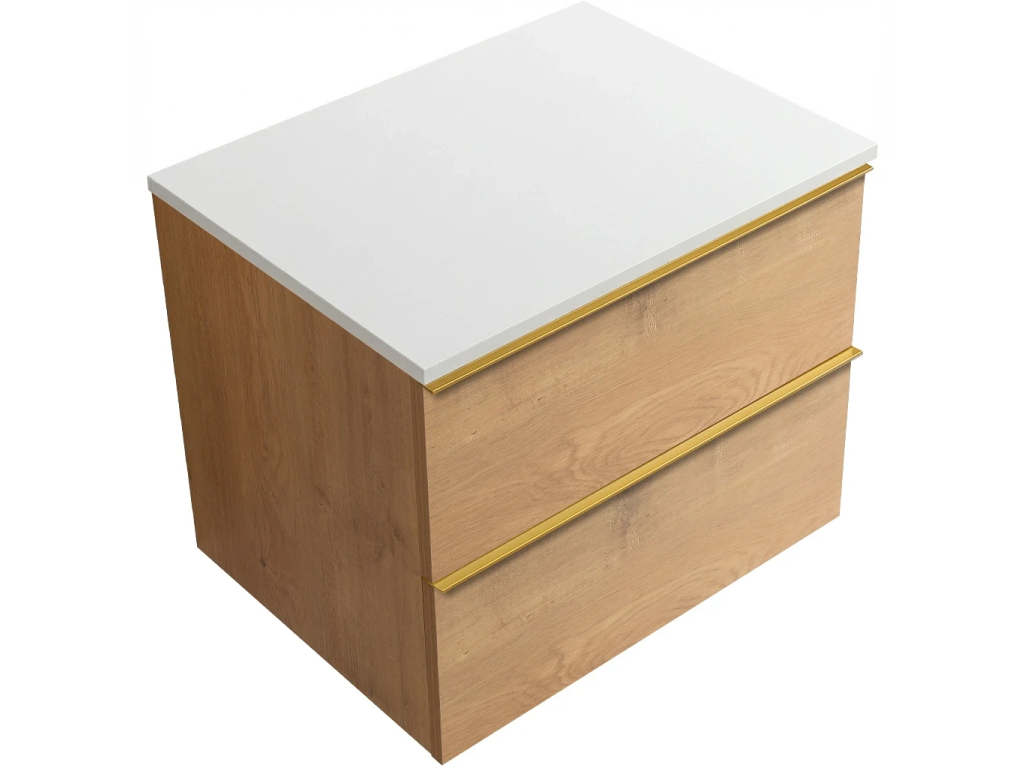 CERANO - Kúpeľňová skrinka Velora - dub medový, úchytka zlatá + doska z lit. mramoru Elanys - 12 mm - biela matná - 70x54,2x46,5 cm