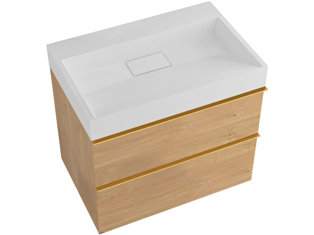 CERANO - Kúpeľňová skrinka Velora - dub medový, úchytka zlatá + umývadlo z lit. mramoru Vita - biela matná - 70x63x46,5 cm