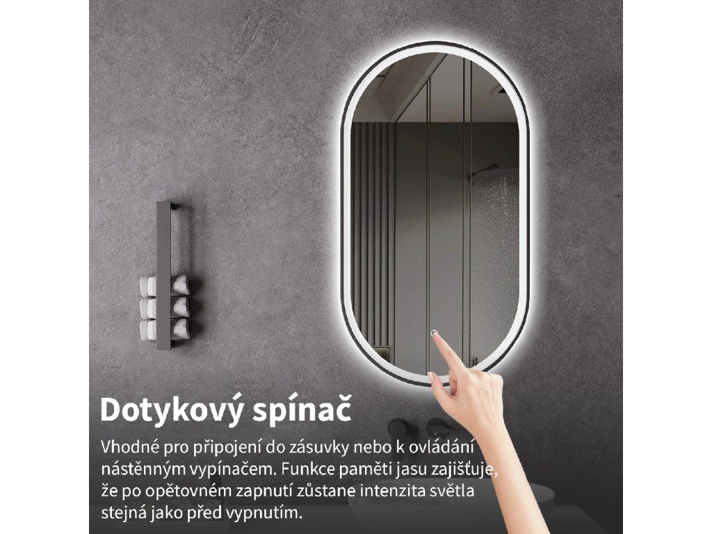 Osvetlenie zrkadla je možné ľahko a pohodlne zapnúť dotykom prepínača na paneli zrkadla. Umožňuje rýchle nastavenie osvetlenia bez nutnosti siahať po vzdialenejšom tradičnom vypínači.