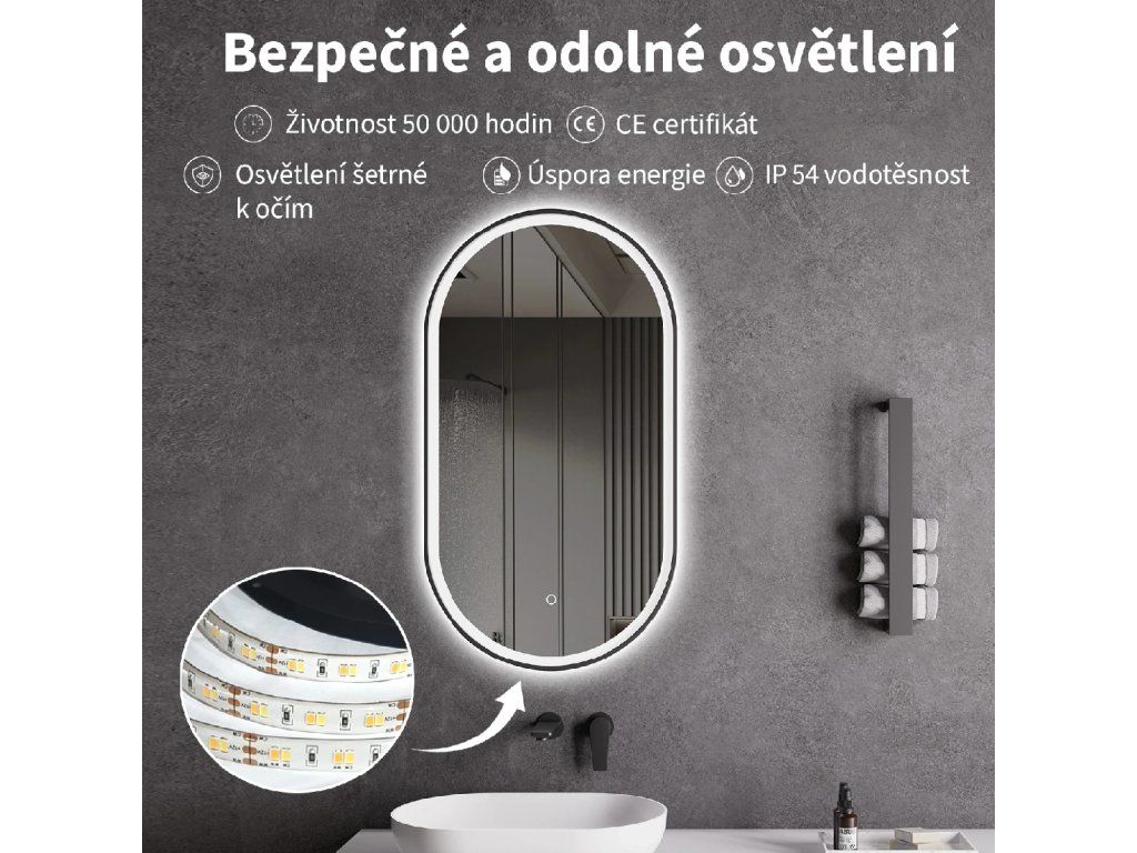 Zrkadlo je vybavené LED osvetlením s nastaviteľnou farbou svetla – od 3000 K (teplá) do 6000 K (Neutrálna). Prepínanie farieb jednoducho ovládate dotykovým tlačidlom na ploche zrkadla. Poskytuje intenzívne a jasné svetlo pre detailnú starostlivosť aj príjemné, jemné osvetlenie na relaxáciu. Vďaka širokému rozsahu teploty farieb tak ľahko prispôsobíte atmosféru aktuálnej potrebe.
