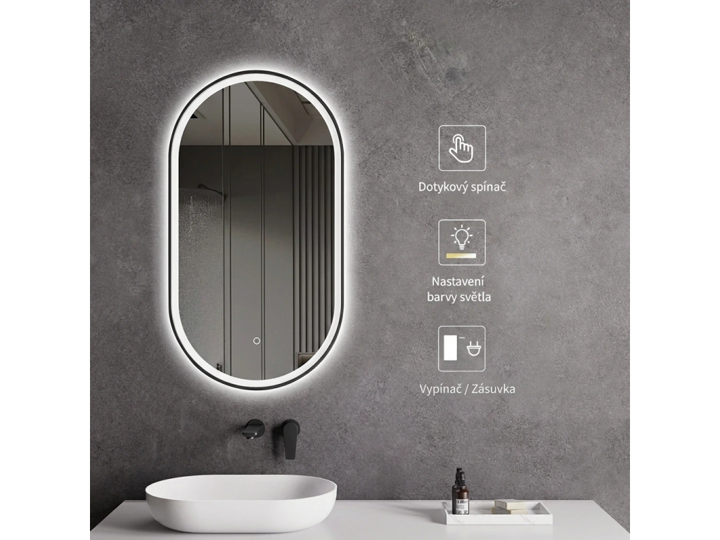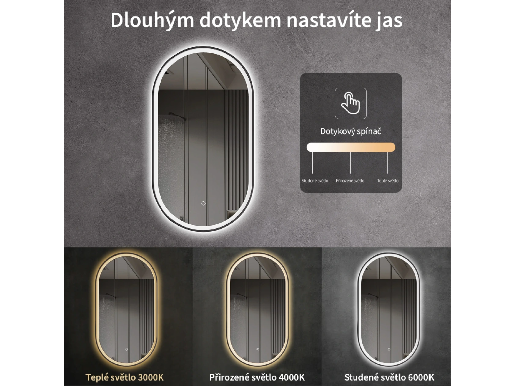 Zrkadlo je vybavené LED osvetlením s nastaviteľnou farbou svetla – od 3000 K (teplá) do 6000 K (Neutrálna). Prepínanie farieb jednoducho ovládate dotykovým tlačidlom na ploche zrkadla. Poskytuje intenzívne a jasné svetlo pre detailnú starostlivosť aj príjemné, jemné osvetlenie na relaxáciu. Vďaka širokému rozsahu teploty farieb tak ľahko prispôsobíte atmosféru aktuálnej potrebe.