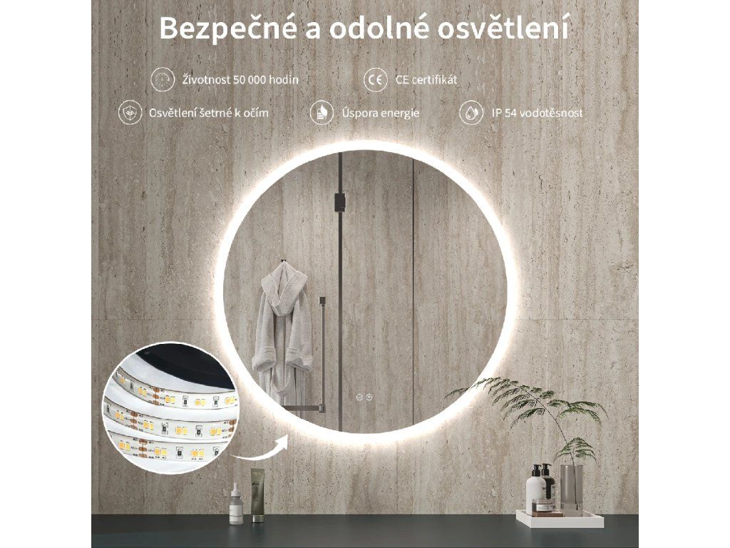 LED osvetlenie pri kúpeľňových zrkadlách prináša množstvo výhod: nižšie prevádzkové náklady, vyššia účinnosť a krytie IP, menšie tepelné vyžarovanie, dlhšia životnosť, možnosť stmievania, voľbu teploty chromatičnosti a rôzne varianty podsvietenia – po obvode, za zrkadlom alebo bodovo.