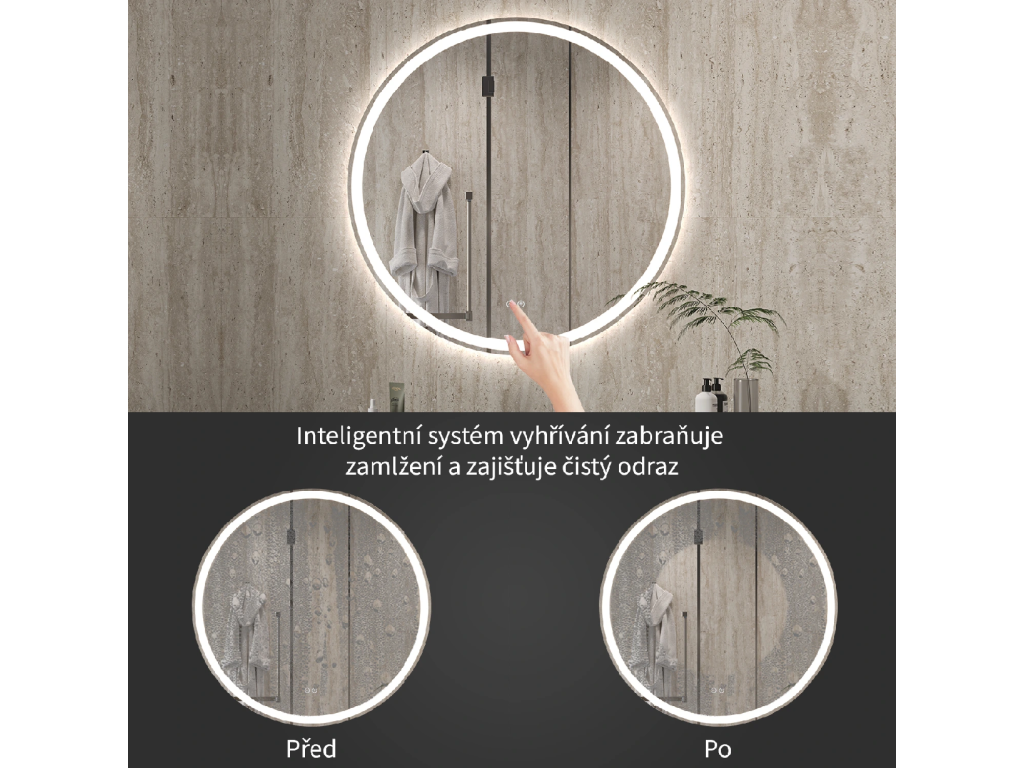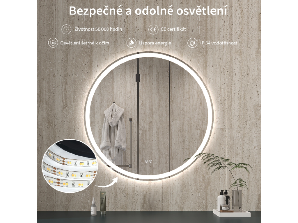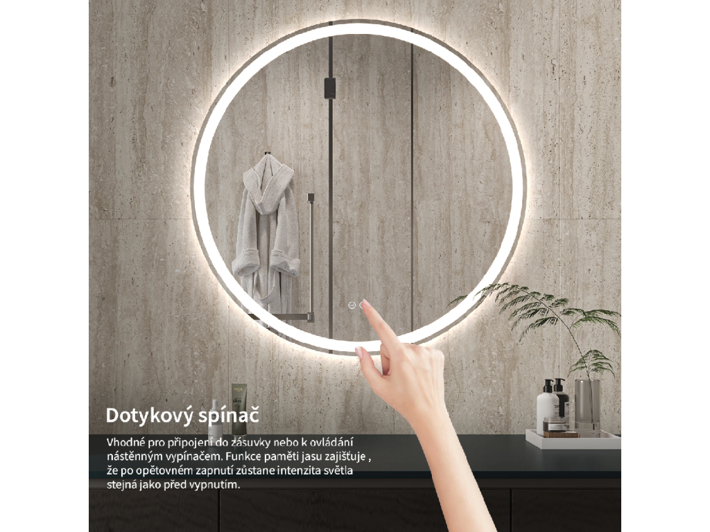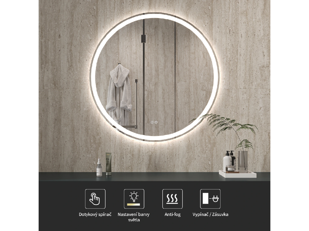 Zrkadlo je vybavené LED osvetlením s nastaviteľnou farbou svetla – od 3000 K (teplá) do 6000 K (Neutrálna). Prepínanie farieb jednoducho ovládate dotykovým tlačidlom na ploche zrkadla. Poskytuje intenzívne a jasné svetlo pre detailnú starostlivosť aj príjemné, jemné osvetlenie na relaxáciu. Vďaka širokému rozsahu teploty farieb tak ľahko prispôsobíte atmosféru aktuálnej potrebe.