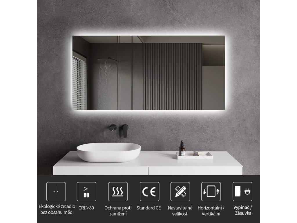 Zrkadlo je vybavené zadným LED podsvietením, ktoré svieti smerom k stene a vytvára jemný svetelný efekt po celom obvode. Rozptýlené svetlo je vyžarované z priestoru medzi rámom a zrkadlom, neoslňuje, zaisťuje rovnomerné a príjemné nasvetlenie priestoru kúpeľne.