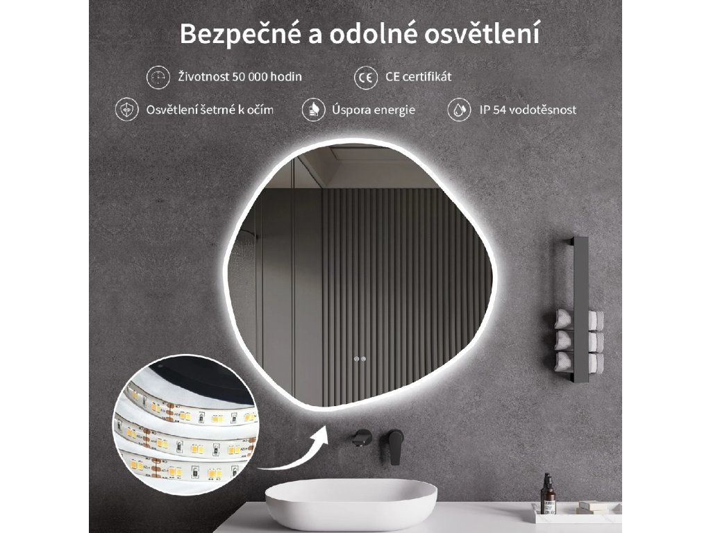 Zrkadlo je vybavené zadným LED podsvietením, ktoré svieti smerom k stene a vytvára jemný svetelný efekt po celom obvode. Rozptýlené svetlo je vyžarované z priestoru medzi rámom a zrkadlom, neoslňuje, zaisťuje rovnomerné a príjemné nasvetlenie priestoru kúpeľne.