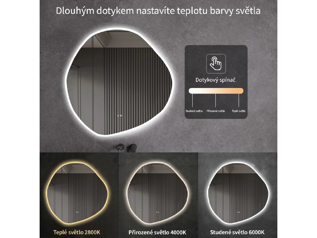 Zrkadlo je vybavené LED osvetlením s nastaviteľnou farbou svetla – od 2800 K (teplá) do 6000 K (Neutrálna). Prepínanie farieb jednoducho ovládate dotykovým tlačidlom na ploche zrkadla. Poskytuje intenzívne a jasné svetlo pre detailnú starostlivosť aj príjemné, jemné osvetlenie na relaxáciu. Vďaka širokému rozsahu teploty farieb tak ľahko prispôsobíte atmosféru aktuálnej potrebe.