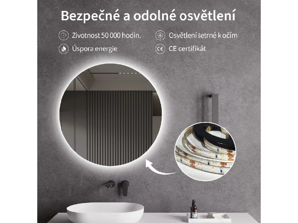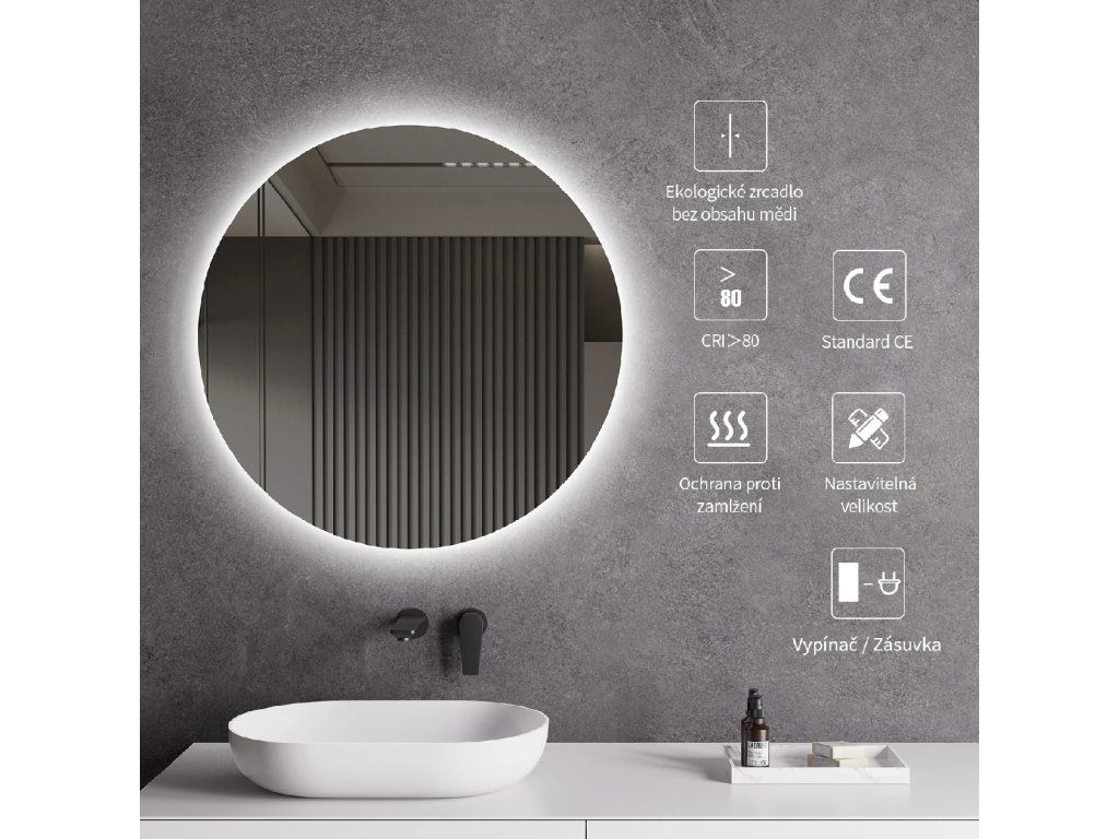 Zrkadlo je vybavené zadným LED podsvietením, ktoré svieti smerom k stene a vytvára jemný svetelný efekt po celom obvode. Rozptýlené svetlo je vyžarované z priestoru medzi rámom a zrkadlom, neoslňuje, zaisťuje rovnomerné a príjemné nasvetlenie priestoru kúpeľne.