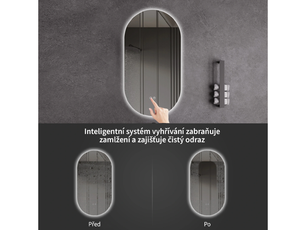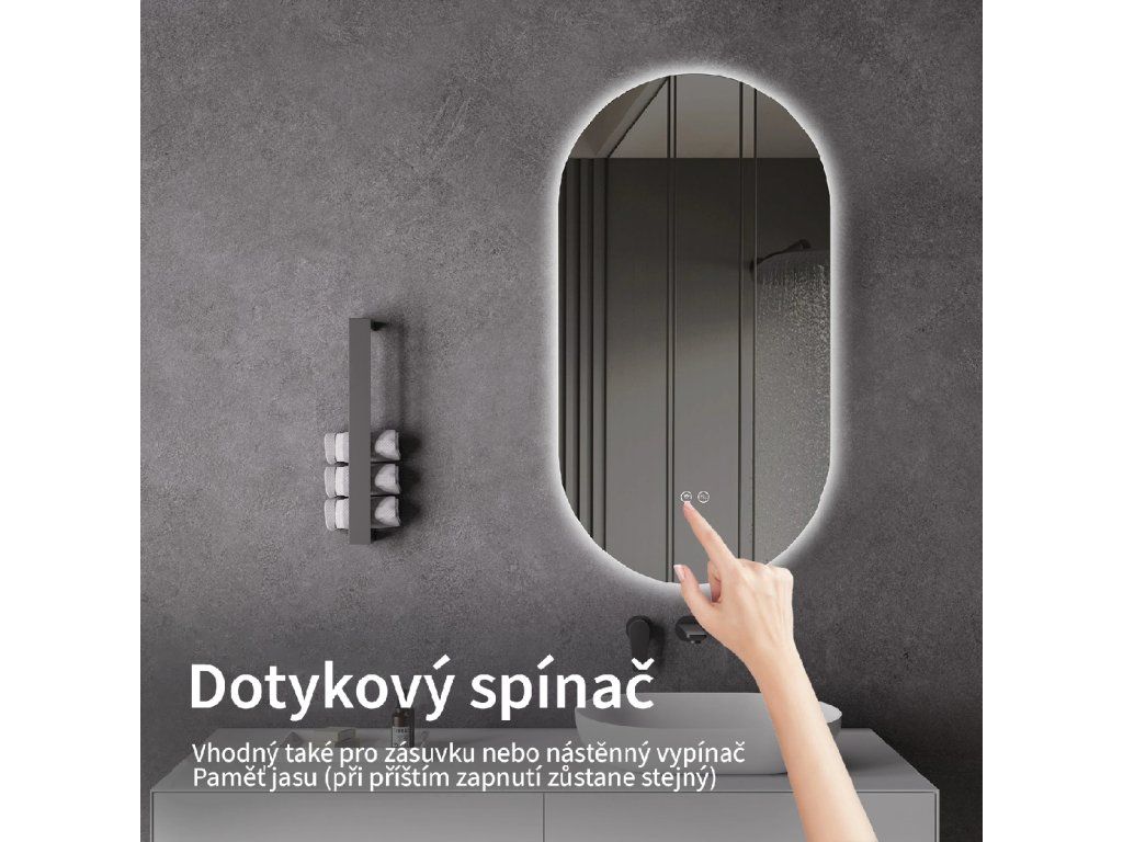 Osvetlenie zrkadla je možné ľahko a pohodlne zapnúť dotykom prepínača na paneli zrkadla. Umožňuje rýchle nastavenie osvetlenia bez nutnosti siahať po vzdialenejšom tradičnom vypínači.