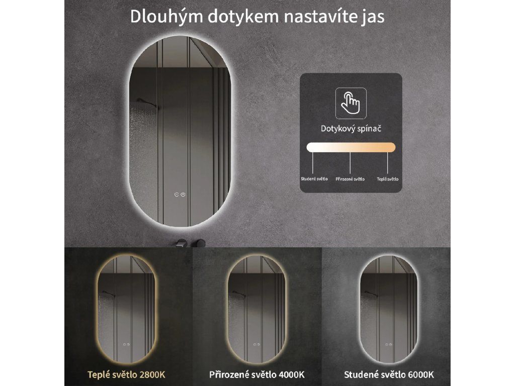 Zrkadlo je vybavené LED osvetlením s nastaviteľnou farbou svetla – od 2800K (teplá) do 6000K (Neutrálna). Poskytuje intenzívne a jasné osvetlenie pre detailnú starostlivosť aj príjemné a jemné svetlo na relaxáciu. Vďaka širokému rozsahu teploty farieb je možné prispôsobiť atmosféru podľa potreby.