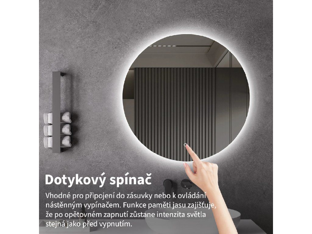 Osvetlenie zrkadla je možné ľahko a pohodlne zapnúť dotykom prepínača na paneli zrkadla. Umožňuje rýchle nastavenie osvetlenia bez nutnosti siahať po vzdialenejšom tradičnom vypínači.