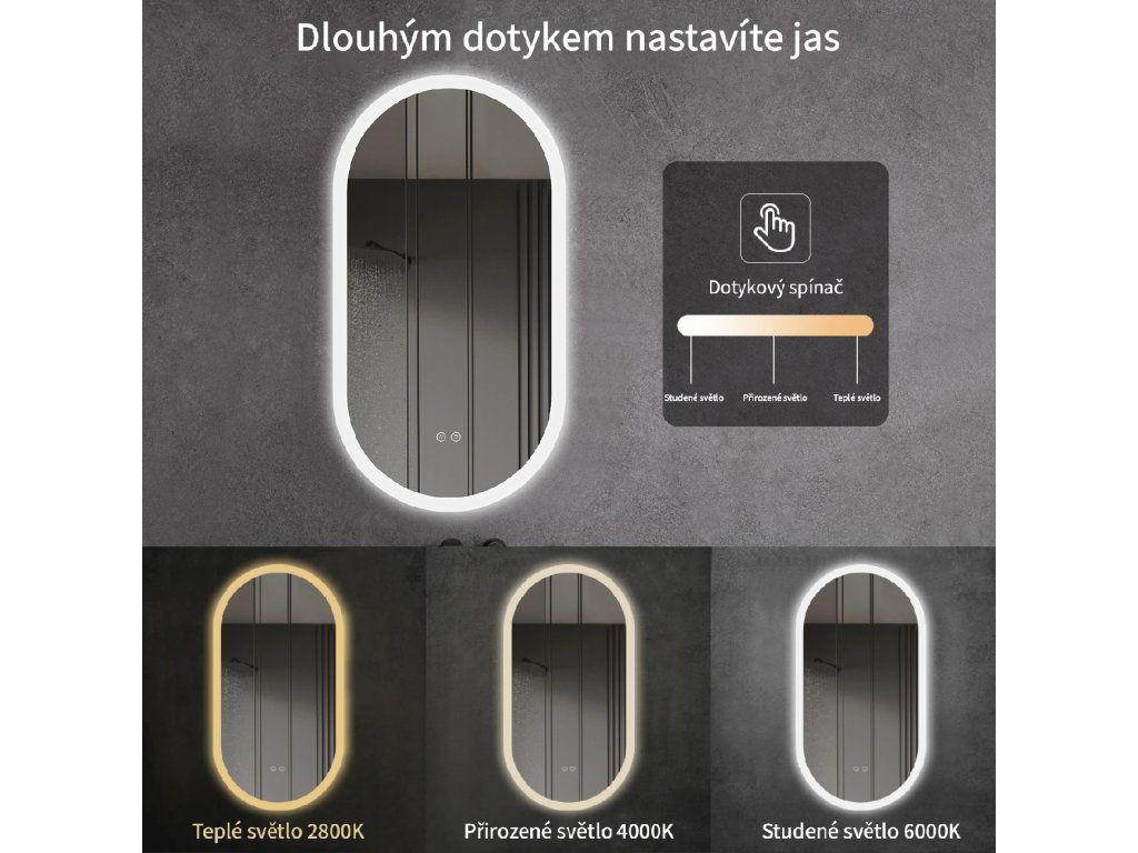 Zrkadlo je vybavené LED osvetlením s nastaviteľnou farbou svetla – od 2800K (teplá) do 6000K (Neutrálna). Poskytuje intenzívne a jasné osvetlenie pre detailnú starostlivosť aj príjemné a jemné svetlo na relaxáciu. Vďaka širokému rozsahu teploty farieb je možné prispôsobiť atmosféru podľa potreby.