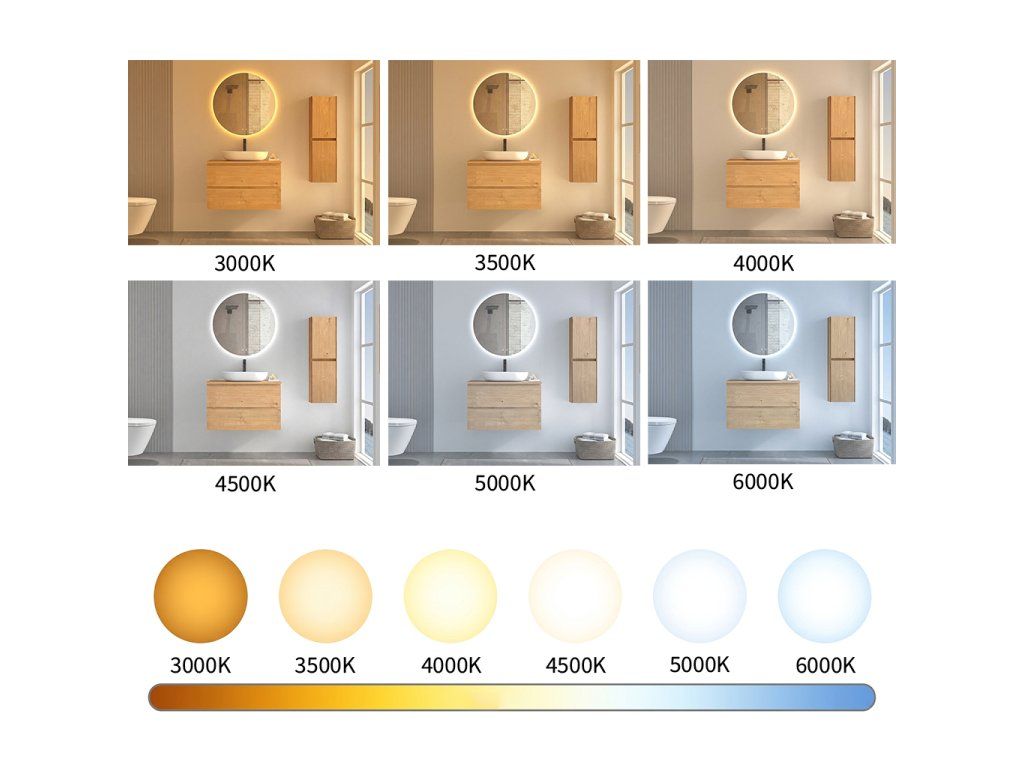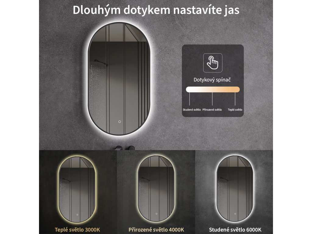 Zrkadlo je vybavené LED osvetlením s nastaviteľnou farbou svetla – od 3000 K (teplá) do 6000 K (Neutrálna). Prepínanie farieb jednoducho ovládate dotykovým tlačidlom na ploche zrkadla. Poskytuje intenzívne a jasné svetlo pre detailnú starostlivosť aj príjemné, jemné osvetlenie na relaxáciu. Vďaka širokému rozsahu teploty farieb tak ľahko prispôsobíte atmosféru aktuálnej potrebe.