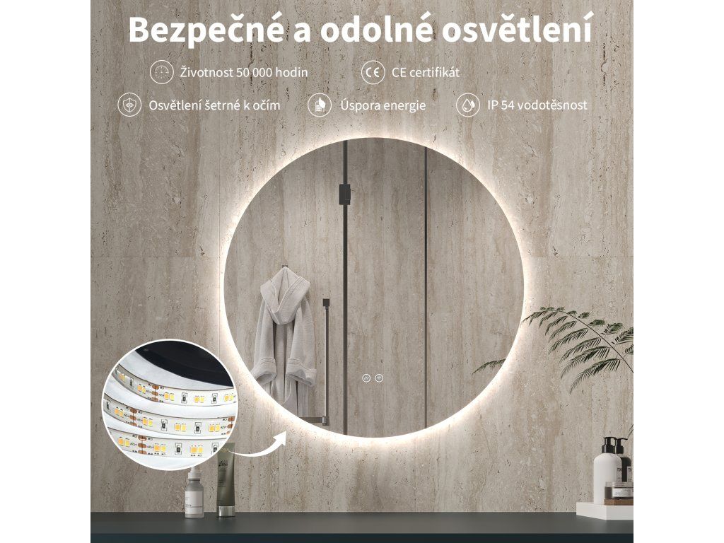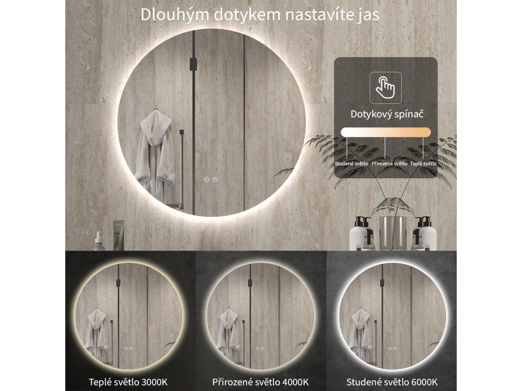 Zrkadlo je vybavené LED osvetlením s nastaviteľnou farbou svetla – od 3000 K (teplá) do 6000 K (Neutrálna). Prepínanie farieb jednoducho ovládate dotykovým tlačidlom na ploche zrkadla. Poskytuje intenzívne a jasné svetlo pre detailnú starostlivosť aj príjemné, jemné osvetlenie na relaxáciu. Vďaka širokému rozsahu teploty farieb tak ľahko prispôsobíte atmosféru aktuálnej potrebe.