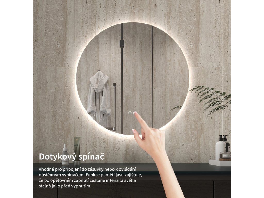 Osvetlenie zrkadla je možné ľahko a pohodlne zapnúť dotykom prepínača na paneli zrkadla. Umožňuje rýchle nastavenie osvetlenia bez nutnosti siahať po vzdialenejšom tradičnom vypínači.