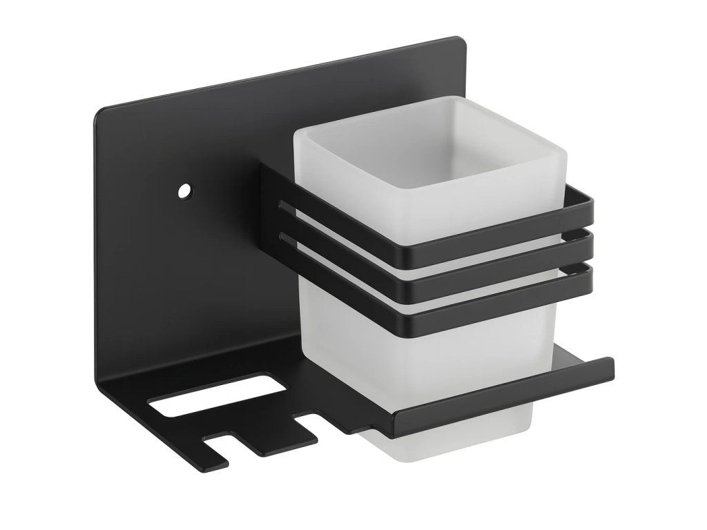 Samotný držiak poskytuje ideálne riešenie pre hygienické zavesenie zubných kefiek a vertikálne postavenie zubnej pasty vo výrezoch vedľa pohára.