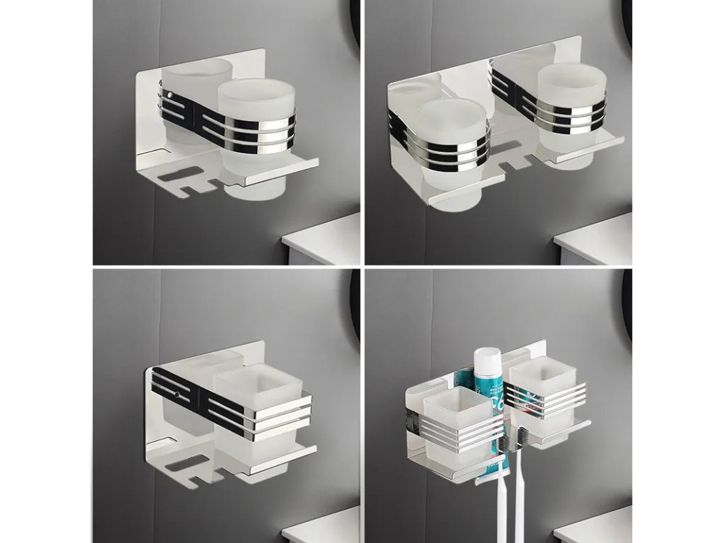 Samotný držiak poskytuje ideálne riešenie na hygienické zavesenie zubných kefiek a vertikálne postavenie zubnej pasty.