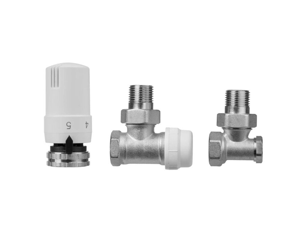 Termostatická sada ventilov určená na stredové pripojenie. Obsahuje termostatický ventil s prednastavenou hodnotou.