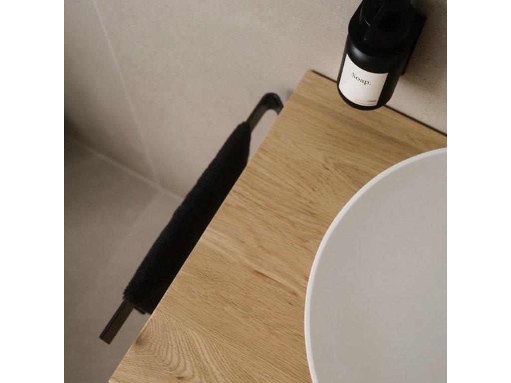 Predná strana disponuje dlhým ramenom, ktoré slúži na umiestnenie uterákov. Toto rameno je pevne upevnené k stene pomocou obojstranne lepiacej vložky, ktorá je diskrétne umiestnená na zadnej strane kratšieho ramena. Jej dokonalá priľnavosť k povrchu steny zaručuje, že držiak bude maximálne stabilný a unesie aj ťažšie tkaniny. Montážne komponenty sú súčasťou balenia.