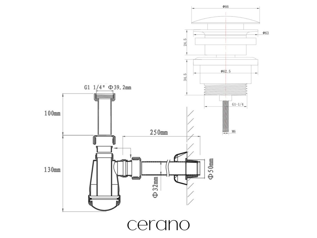 CERANO - Sifón umývadlový - 5/4" - mosadz - DN32/40/50 mm - s výpustom click-clack - bez prepadu - biela