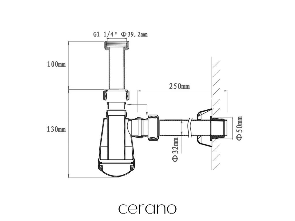CERANO - Sifón umývadlový - DN32-50/250 mm - biela lesklá s výpustom click-clack s prepadom - plast - 35/50mm - chróm