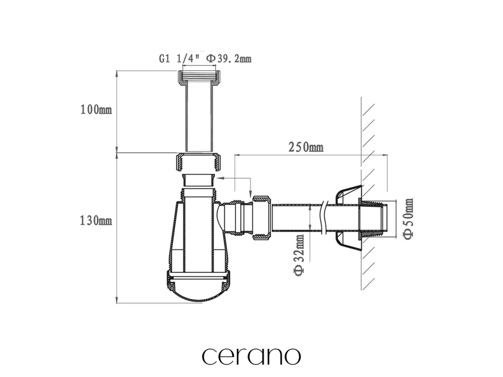 CERANO - Sifón umývadlový - DN32-50/250 mm - biela lesklá s výpustou click-clack - univerzálna - plast - čierna matná