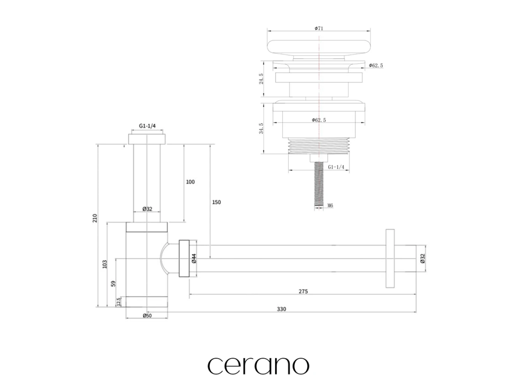 CERANO - Sifón umývadlový - mosadz - DN32 mm s výpustom click-clack s prepadom - keramická zátka - biela
