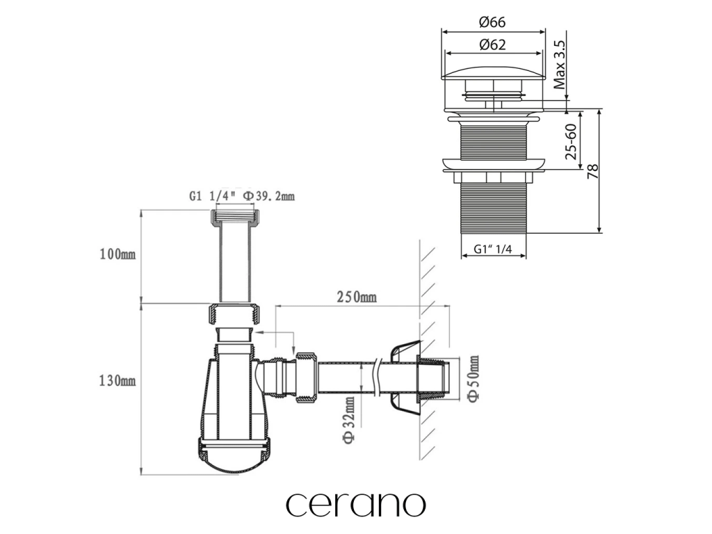 CERANO - Sifón umývadlový - plast - DN32/40/50 s výpustom click-clack s prepadom - biela
