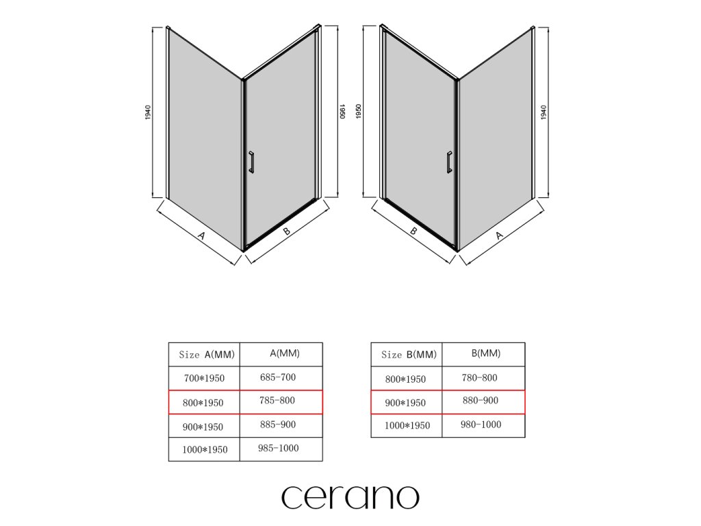 V rámci tejto série ponúkame širokú škálu rozmerov, aby sme uspokojili rôzne potreby našich zákazníkov. Všetky sprchové kúty, dvere a zásteny značky CERANO sú plne kompatibilné so sprchovými vaničkami CERANO v rovnakých rozmeroch, čo zaisťuje bezproblémovú inštaláciu a dokonalé zladenie. Sprchovací kút je možné navyše inštalovať flexibilne – buď na zodpovedajúcu sprchovú vaničku, alebo priamo na podlahu podľa vašich preferencií a možností kúpeľne.