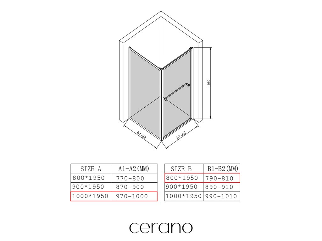 V rámci tejto série ponúkame širokú škálu rozmerov, aby sme uspokojili rôzne potreby našich zákazníkov. Všetky sprchové kúty, dvere a zásteny značky CERANO sú plne kompatibilné so sprchovými vaničkami CERANO v rovnakých rozmeroch, čo zaisťuje bezproblémovú inštaláciu a dokonalé zladenie. Sprchovací kút je možné navyše inštalovať flexibilne – buď na zodpovedajúcu sprchovú vaničku, alebo priamo na podlahu podľa vašich preferencií a možností kúpeľne.
