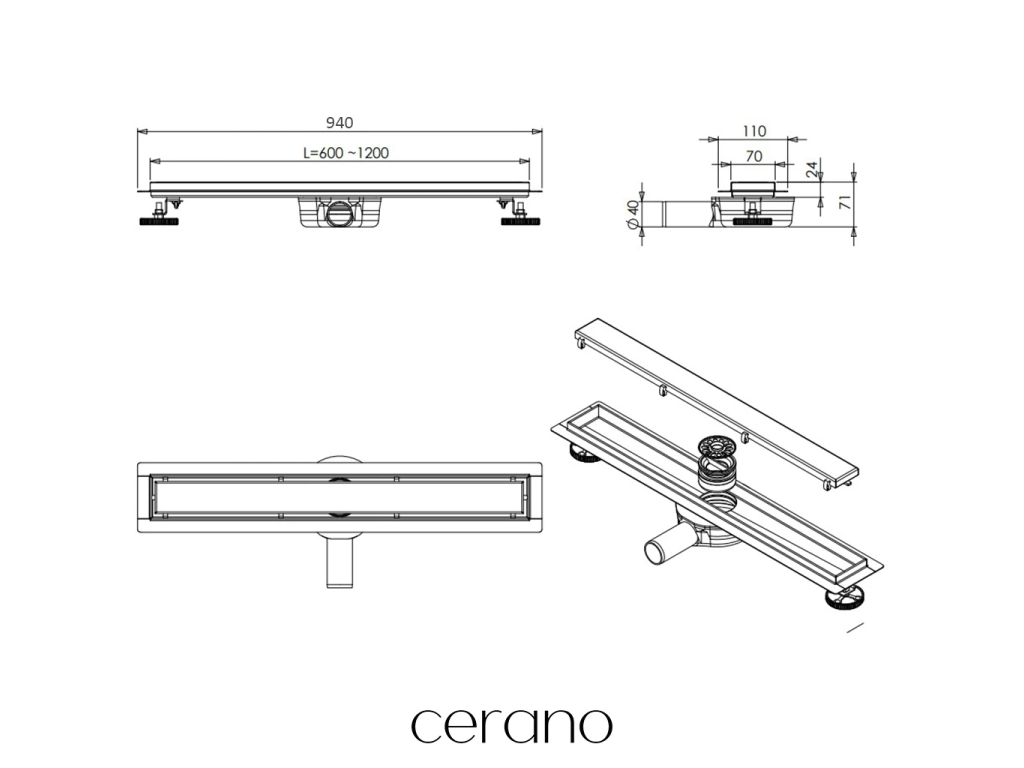 CERANO - Sprchový odtokový žľab, sifón otočný 360 ° - dizajn 2v1 - nerez - DN40 - čierna matná - 94 cm