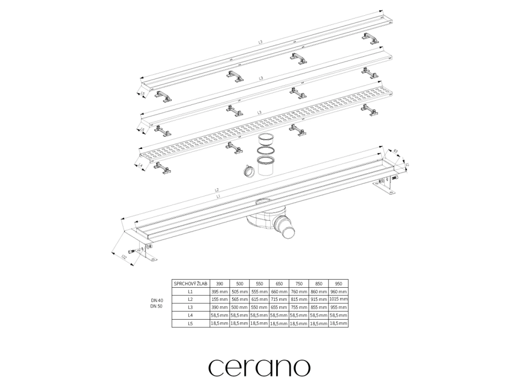 CERANO - Sprchový odtokový žľab, sifón otočný 360 ° - DN50 - nerez - 92 cm