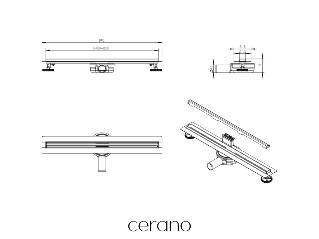 CERANO - Sprchový odtokový žľab Slim, so sifónom, otočný 360 ° - nerez - 94 cm
