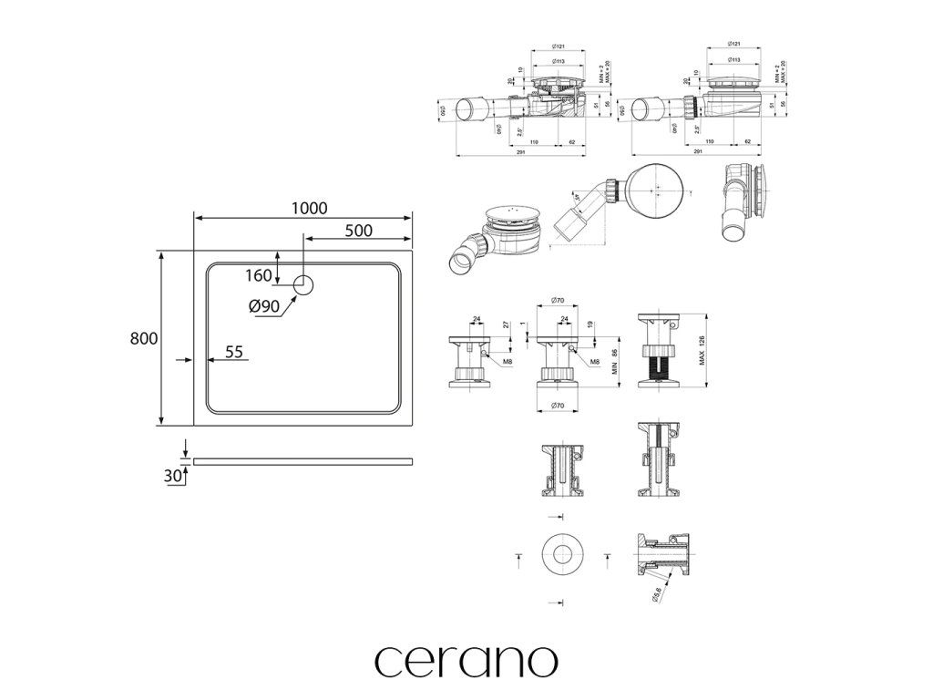 CERANO - Sprchový vaničkový set Piato - liaty mramor - biela lesklá - 100x80 cm + nožičky + sifón sprch.vaničky