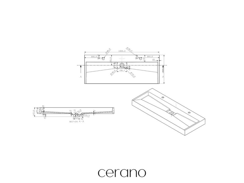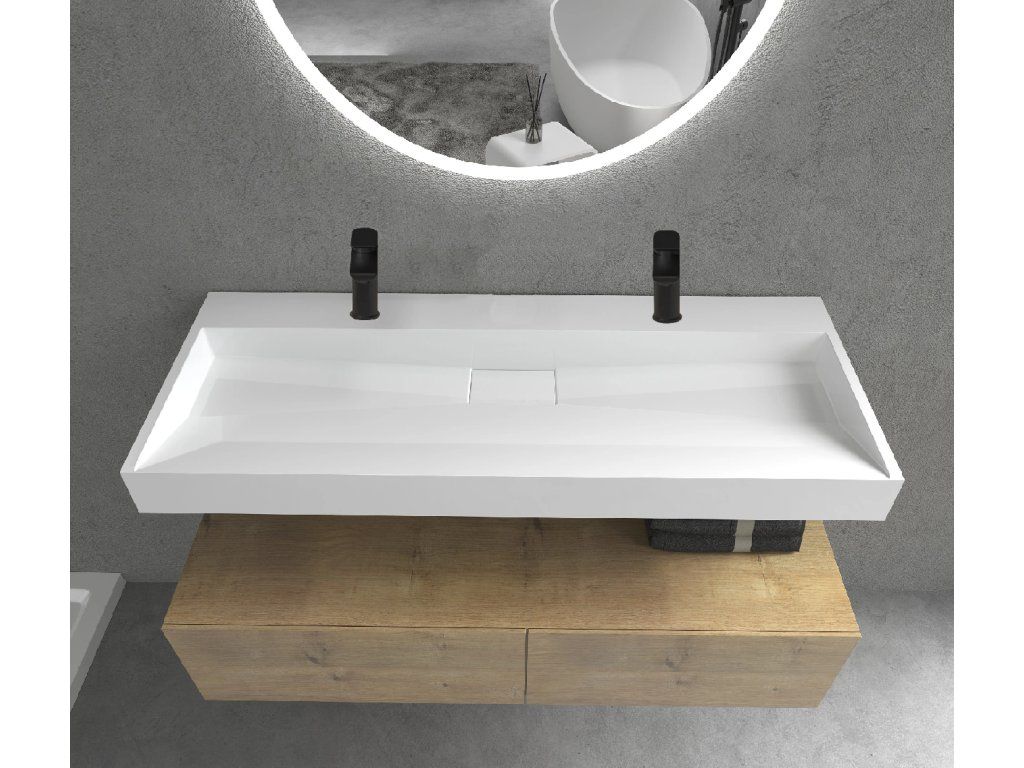 CERANO - Umývadlo z liateho mramoru Vita - nástenné aj na dosku - 2 otvory pre batériu - biela lesklá - 120x46 cm